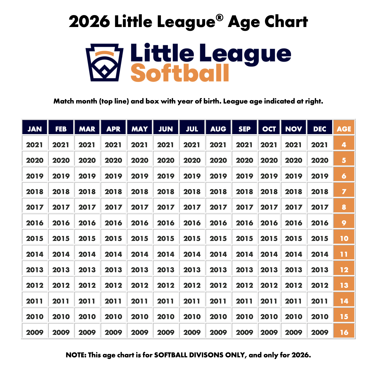 Below you will find the 2026 Little League Age Charts.  Or, click the link below to calculate your child's Little League Age.